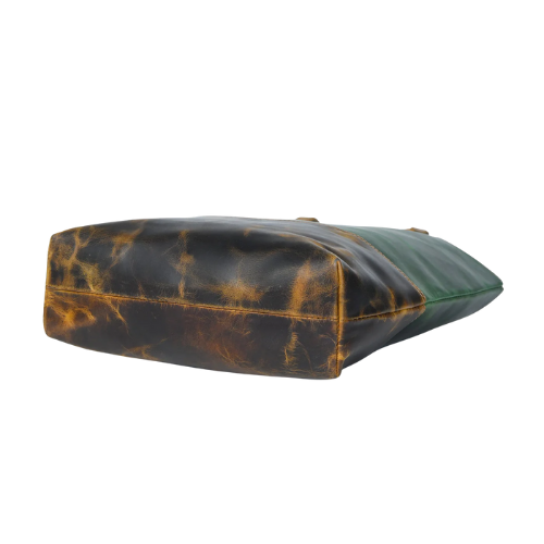 A striking tote that combines bold green leather with a rustic brown base, creating a stylish contrast. The tall silhouette provides plenty of space for essentials, while the long leather straps make it comfortable for everyday shoulder carry. Finished with clean stitching and natural texture, this tote blends practicality with standout design.